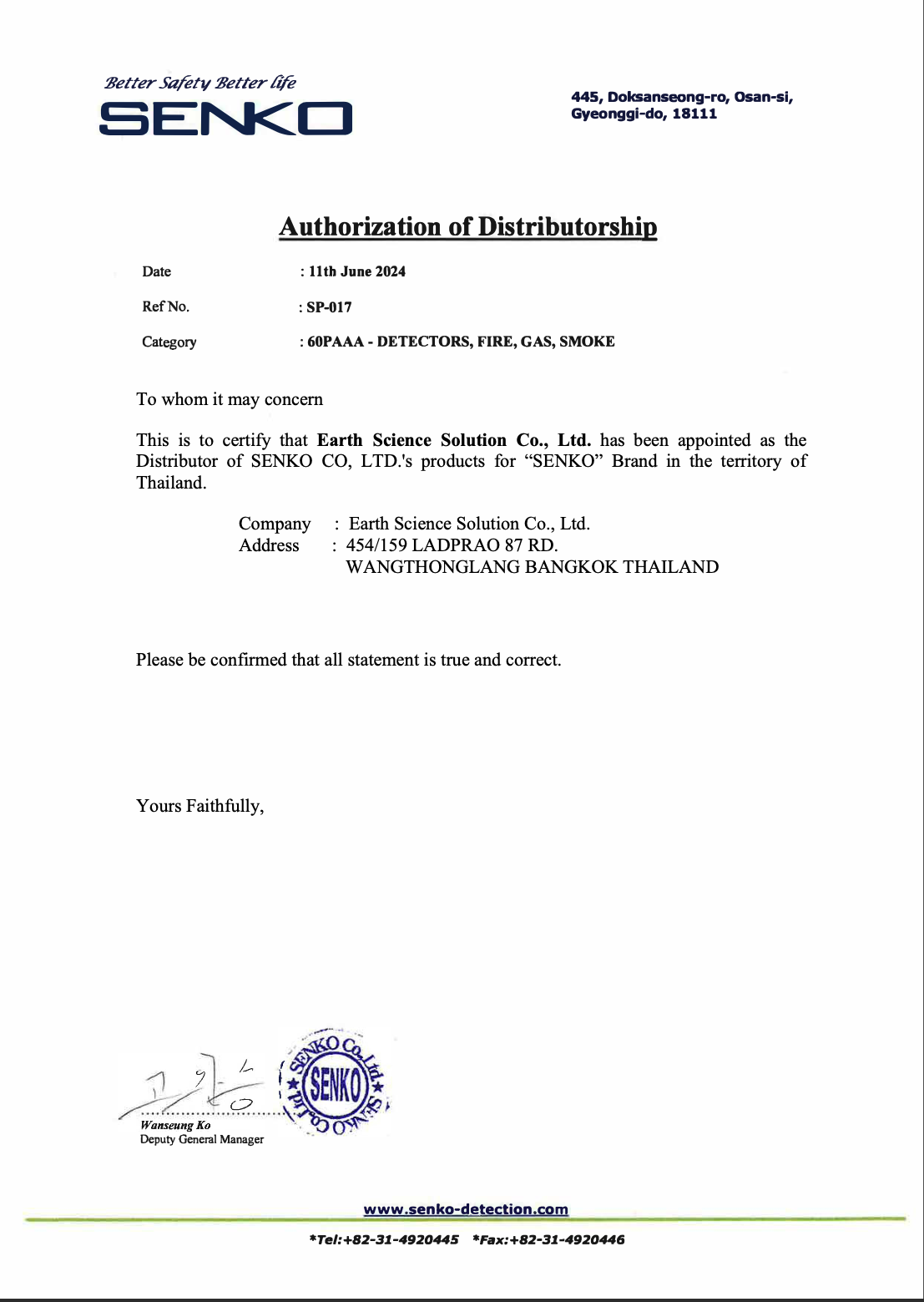 บริษัทเอิร์ธ ไซเอนซ โซลูชั่น จำกัด ได้รับการแต่งตั้งเป็นตัวแทนจำหน่าย อย่างเป็นทางการจากบริษัท Senko ประเทศเกาหลีใต้ ให้เป็นตัวแทนจําหน่าย Gas detector