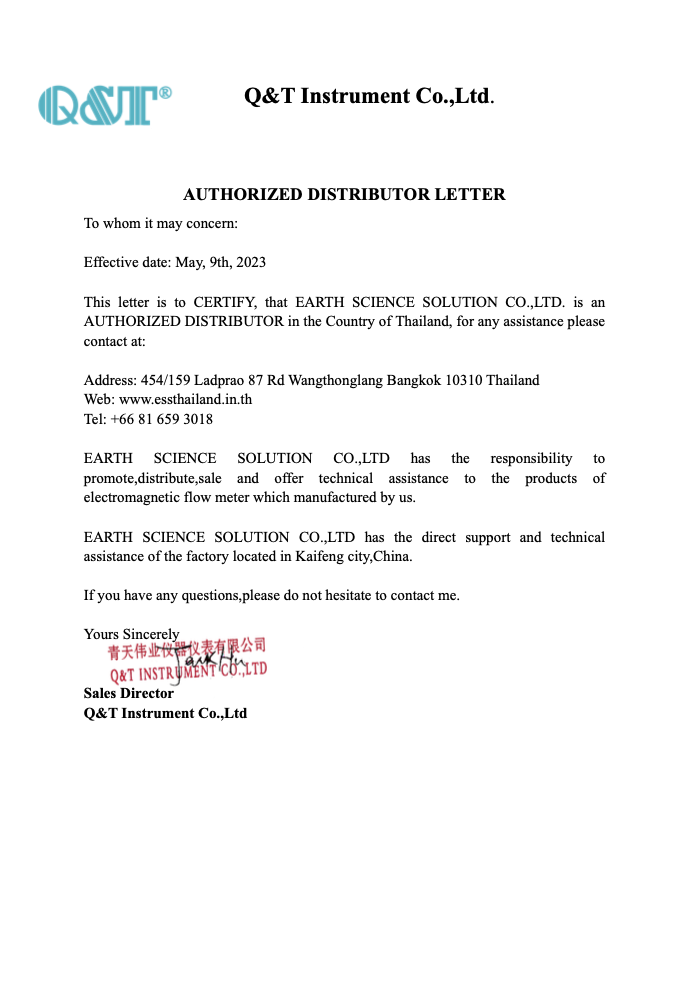 บริษัทเอิร์ธ ไซเอนซ โซลูชั่น จำกัด ได้รับการแต่งตั้งเป็นตัวแทนจำหน่าย อย่างเป็นทางการจากบริษัท Q&T Instrument ประเทศจีน ให้เป็นตัวแทนจําหน่าย Flowmeter