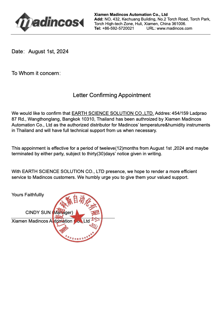 บริษัทเอิร์ธ ไซเอนซ โซลูชั่น จำกัด ได้รับการแต่งตั้งเป็นตัวแทนจำหน่าย อย่างเป็นทางการจากบริษัท Xiamen Madincos Automation ประเทศจีน ให้เป็นตัวแทนจําหน่าย temperature and humidity