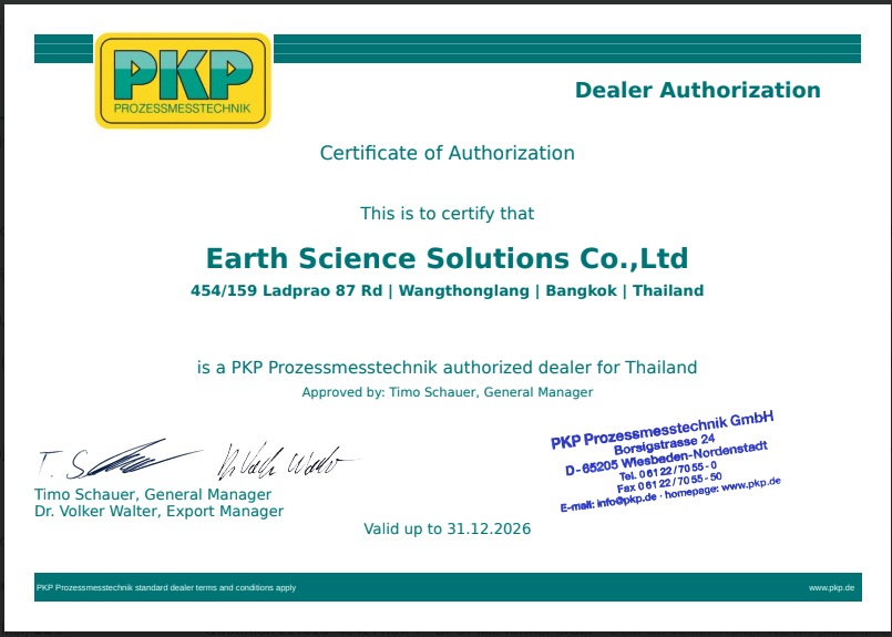 บริษัทเอิร์ธ ไซเอนซ โซลูชั่น จำกัด ได้รับการแต่งตั้งเป็นตัวแทนจำหน่าย อย่างเป็นทางการจากบริษัท PKP ประเทศเยอรมันนี ให้เป็นตัวแทนจําหน่าย Flowmeter